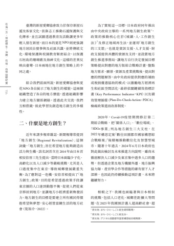 %u81fa%u7063%u7684%u65b0%u5c4b%u611b%u9109%u5354%u6703%u81f4%u529b%u65bc%u4fdd%u5b58%u65b0%u5c4b%u77f3%u6eec%u53ca%u5ba2%u5bb6%u6587%u5316%uff0c%u4f9d%u9760%u5fd7%u5de5%u63a8%u52d5%u77f3%u6eec%u4fdd%u8b77%u8207%u6587%u5316%u50b3%u627f%uff0c%u4e26%u4e14%u8a66%u5716%u900f%u904e%u6559%u80b2%u53ca%u6d3b%u52d5%u8b93%u66f4%u591a%u5e74%u8f15%u4eba%u7559%u5728%u65b0%u5c4b%uff0c%u800c%u65e5%u672c%u7684%u590f%u82b1 NPO%u5247%u66f4%u5f37%u8abf%u5730%u65b9%u5c45%u6c11%u81ea%u767c%u53c3%u8207%u53ca%u793e%u5340%u5171%u8b58%uff0c%u4e26%u5c07%u50b3%u7d71%u6587%u5316%u3001%u74b0%u5883%u4fdd%u8b77%u8207%u6821%u5712%u6559%u80b2%u7dca%u5bc6%u7d50%u5408%uff0c%u4ee5%u4fdd%u8b77%u77f3%u57a3%u5cf6%u7684%u73ca%u745a%u7901%u53ca%u6d77%u795e%u6587%u5316%u3002%u9019%u6a23%u7684%u5dee%u7570%u53cd%u6620%u51fa%u81fa%u5f4e%u3001%u65e5%u672c%u5169%u5730%u5728%u5730%u65b9%u5275%u751f%u7b56%u7565%u4e0a%u7684%u4e0d%u540c%u4e4b%u8655%u3002%u7d9c%u5408%u6211%u5011%u524d%u9762%u6240%u8aaa%uff0c%u65b0%u5c4b%u611b%u9109%u5354%u6703%u8207%u590f%u82b1 NPO%u5404%u81ea%u5c55%u793a%u4e86%u5730%u65b9%u5275%u751f%u7684%u6a23%u8c8c%u3002%u9019%u5169%u500b%u7d44%u7e54%u5851%u9020%u4e86%u5404%u81ea%u7684%u5730%u65b9%u50f9%u503c%uff0c%u900f%u904e%u7d44%u7e54%u5f71%u97ff%u529b%u5efa%u7acb%u5730%u65b9%u95dc%u4fc2%u7db2%u7d61%u3002%u900f%u904e%u6b64%u6b21%u4ea4%u6d41%uff0c%u6211%u5011%u4e92%u76f8%u501f%u93e1%uff0c%u5f7c%u6b64%u5b78%u7fd2%u53ca%u5275%u9020%u5730%u65b9%u5275%u751f%u7684%u591a%u6a23%u6027%u3002%u8fd1%u5e74%u4f86%u8af8%u591a%u5831%u7ae0%u96dc%u8a8c%u3001%u65b0%u805e%u5831%u5c0e%u5e38%u63d0%u5230%u300c%u5730 %u65b9%u5275 %u751f%uff08Regional Revitalization%uff09%u300d%u9019%u500b%u8a5e%u5f59%uff0c%u300c%u5730%u65b9%u5275%u751f%u300d%u65e8%u5728%u5e0c%u671b%u5730%u65b9%u80fd%u5920%u5275%u9020%u51fa%u6d3b%u529b%u8207%u751f%u6a5f%u3002%u8a72%u540d%u8a5e%u9996%u6b21%u57282014%u5e74%u7531%u65e5%u672c%u9996%u76f8%u5b89%u500d%u6649%u4e09%u5148%u751f%u63d0%u51fa%uff0c%u7576%u6642%u65e5%u672c%u9762%u81e8%u5c11%u5b50%u5316%u3001%u9ad8%u9f61%u5316%u4ee5%u53ca%u4eba%u53e3%u6e1b%u5c11%u7b49%u56b4%u5cfb%u6311%u6230%uff0c%u5c24%u5176%u662f%u4eba%u53e3%u904e%u5ea6%u96c6%u4e2d%u5728%u6771%u4eac%uff0c%u5c0e%u81f4%u57ce%u9109%u767c%u5c55%u56b4%u91cd%u5931%u8861%u3002%u70ba%u4e86%u61c9%u5c0d%u9019%u4e00%u5371%u6a5f%uff0c%u5b89%u500d%u9996%u76f8%u63d0%u51fa%u4e86%u300c%u5730%u65b9%u5275%u751f%u300d%u653f%u7b56%uff0c%u76ee%u7684%u662f%u5e0c%u671b%u900f%u904e%u653f%u7b56%u624b%u6bb5%u8b93%u6771%u4eac%u5708%u7684%u4eba%u53e3%u9054%u5230%u52d5%u614b%u5e73%u8861%uff0c%u4fc3%u4f7f%u4eba%u5011%u5f9e%u6771%u4eac%u79fb%u5c45%u5230%u5730%u65b9%uff0c%u4e26%u8b93%u5730%u65b9%u5c0f%u7d93%u6fdf%u91cd%u65b0%u7165%u767c%u6d3b%u529b%u3002%u5730%u65b9%u5275%u751f%u7684%u76ee%u6a19%u662f%u8981%u5efa%u7acb%u6240%u6709%u570b%u6c11%u5f97%u61f7%u62b1%u5e0c%u671b%u8207%u5922%u60f3%uff0c%u5b89%u5fc3%u7d93%u71df%u5bcc%u9952%u751f%u6d3b%u7684%u5730%u65b9%u793e%u6703%uff08%u7b67%u88d5%u4ecb%uff0c2022%uff09%u3002%u70ba%u4e86%u5be6%u73fe%u9019%u4e00%u76ee%u6a19%uff0c%u65e5%u672c%u653f%u5e9c%u540c%u5e74%u63a8%u51fa%u7531%u4e2d%u592e%u653f%u5e9c%u4e3b%u5c0e%u7684%u4e00%u7cfb%u5217%u5730%u65b9%u5275%u751f%u653f%u7b561%uff0c%u653f%u7b56%u7684%u63a8%u52d5%u6838%u5fc3%u5728%u65bc%u300a%u57ce%u93ae%u3001%u4eba%u3001%u5de5%u4f5c%u5275%u751f%u6cd5 %u300b 2%u53ca%u4fee%u6b63%u5730%u57df%u518d%u751f%u6cd5%uff0c%u4e26%u904b%u7528%u300c%u5730%u65b9%u5275%u751f%u7684%u4e09%u652f%u7bad%u300d%uff0c%u4e5f%u5c31%u662f%u8cc7%u8a0a%u652f%u63f4%u3001%u4eba%u624d%u652f%u63f4%u3001%u8ca1%u653f%u652f%u63f4%u63d0%u4f9b%u5177%u9ad4%u7684%u8cc7%u6e90%u53ca%u652f%u6301%uff0c%u4e26%u8a2d%u7f6e%u5730%u65b9%u5275%u751f%u63a8%u9032%u4e8b%u52d9%u5c40%uff0c%u8b93%u5730%u65b9%u81ea%u884c%u6c7a%u5b9a%u767c%u5c55%u76ee%u6a19%u7b56%u7565%u63d0%u51fa%u5c0d%u61c9%u7684%u5730%u65b9%u7248%u7d9c%u5408%u6230%u7565%u8a08%u756b%uff0c%u76e4%u9ede%u5730%u65b9%u9700%u6c42%u3001%u9858%u666f%u3001%u8cc7%u6e90%u53ca%u7522%u696d%u6311%u6230%u5f8c%uff0c%u63d0%u51fa%u5c0d%u61c9%u7684%u554f%u984c%u89e3%u7b54%uff0c%u7531%u4e2d%u592e%u653f%u5e9c%u63d0%u4f9b%u5c0d%u61c9%u7684%u88dc%u52a9%u6216%u7a05%u6350%u512a%u60e0%u5354%u52a9%u7684%u6a21%u5f0f%uff0c%u4ee5%u6fc0%u52f5%u5730%u65b9%u7d93%u6fdf%u518d%u751f%u548c%u793e%u5340%u7a7a%u9593%u6d3b%u5316%uff0c%u6700%u7d42%u4f9d%u95dc%u9375%u7e3e%u6548%u6307%u6a19%u8a08%u756b%uff08Key Performance Indicator%uff0cKPI%uff09%u4ee5%u53ca%u7e3e%u6548%u7ba1%u7406%u5faa%u74b0%uff08Plan-Do-Check-Action%uff0cPDCA%uff09%u6aa2%u8996%u653f%u7b56%u9032%u800c%u6539%u5584%u5236%u5ea6%u30022020%u5e74%uff0cCovid-19%u75ab %u60c5 %u671f%u9593%u4fee%u8a02%u7b2c%u4e8c%u671f%u7d9c%u5408%u6230%u7565%uff0c%u628a%u300c%u95dc%u4fc2%u4eba%u53e3%u300d%u3001%u300c%u6578%u4f4d%u5834%u57df%u300d%u3001%u300cSDGs%u4e8b%u696d%u300d%u5217%u70ba%u5730 %u65b9 %u5275 %u751f %u4e09 %u5927 %u652f %u67f1%uff0c %u57282022%u5e74%u69cb%u601d%u5b9a%u6848%u300c%u6578%u4f4d%u7530%u5712%u90fd%u5e02%u570b%u5bb6%u69cb%u60f3%u7d9c%u5408%u6230%u7565%u6848%u300d3%u5f8c%u7a4d%u6975%u63a8%u52d5%u6578%u4f4d%u5316%u53ca%u667a%u6167%u578b%u57ce%u5e02%u3002%u96a8%u8457%u5341%u5e74%u904e%u53bb%uff0c2024%u5e746%u6708%u65e5%u672c%u653f%u5e9c%u4e5f%u5c0d%u6b64%u505a%u51fa%u6aa2%u8a0e%u53ca%u672a%u4f86%u63a8%u9032%u65b9%u5411%u8aaa%u660e%uff0c%u96d6%u5c1a%u672a%u5fb9%u5e95%u89e3%u6c7a%u4eba%u53e3%u6e1b%u5c11%u53ca%u6771%u4eac%u96c6%u4e2d%u904e%u591a%u4eba%u53e3%u7684%u8da8%u52e2%uff0c%u4f46%u900f%u904e%u4f01%u696d%u53ca%u5730%u65b9%u6a5f%u95dc%u5916%u9077%u3001%u5730%u65b9%u632f%u8208%u5354%u529b%u968a%u3001%u7522%u5b98%u5b78%u5408%u4f5c%u7b49%u63aa%u65bd%u7684%u78ba%u6709%u7559%u4e0b%u4eba%u624d%u6df1%u8015%uff0c%u4e5f%u56e0%u6b64%u4ecd%u6301%u7e8c%u63a8%u52d5%u9019%u9805%u8a08%u756b%uff0c%u672a%u4f86%u5c07%u7e7c%u7e8c%u52aa%u529b%u3002%u76f8 %u8f03 %u4e4b%u4e0b%uff0c%u6211 %u570b %u4e5f%u9762%u81e8 %u8457%u8207%u65e5%u672c %u76f8 %u4f3c%u7684%u6311%u6230%uff0c%u5305%u62ec%u4eba%u53e3%u8001%u5316%u3001%u57ce%u9109%u5dee%u8ddd%u64f4%u5927%u7b49%u554f%u984c%uff