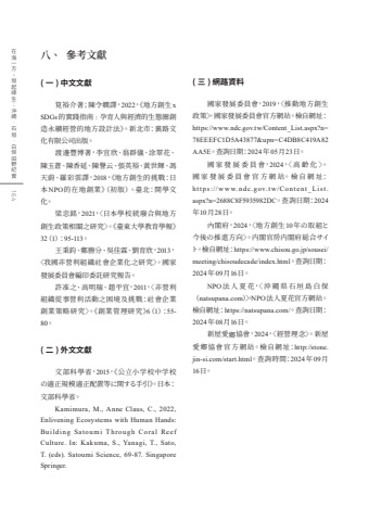 164%u5728%u6d77%u4e00%u65b9%u3001%u57a3%u8d77%u7de3%u751f%uff1a%u6c96%u7e69%u00b7%u77f3%u57a3%u00b7%u767d%u4fdd%u7530%u91ce%u7d00%u5be6%u516b%u3001%u0009 %u53c3%u8003%u6587%u737b( %u4e00 ) %u4e2d%u6587%u6587%u737b%u7b67%u88d5%u4ecb%u8457%uff1b%u9673%u4ee4%u5afb%u8b6f%uff0c2022%uff0c%u300a%u5730%u65b9%u5275%u751fx SDGs%u7684%u5be6%u8e10%u6307%u5357 : %u5b55%u80b2%u4eba%u8207%u7d93%u6fdf%u7684%u751f%u614b%u5708%u5275%u9020%u6c38%u7e8c%u7d93%u71df%u7684%u5730%u65b9%u8a2d%u8a08%u6cd5%u300b%u3002%u65b0%u5317%u5e02%uff1a%u88cf%u8def%u6587%u5316%u6709%u9650%u516c%u53f8%u51fa%u7248%u3002%u6e21%u908a%u8c50%u535a%u8457%uff0c%u674e%u5b9c%u6b23%u3001%u7fc1%u7fa4%u5100%u3001%u6d82%u7fe0%u82b1%u3001%u9673%u7389%u84bc%u3001%u9673%u9999%u5ef6%u3001%u9673%u8b7d%u4e91%u3001%u5f35%u82f1%u88d5%u3001%u9ec3%u4e16%u8f1d%u3001%u99ae%u5929%u851a%u3001%u7f85%u5f69%u96f2%u8b6f%uff0c2018%uff0c%u300a%u5730%u65b9%u5275%u751f%u7684%u6311%u6230%uff1a%u65e5%u672cNPO%u7684%u5728%u5730%u5275%u696d%u300b%uff08%u521d%u7248%uff09%u3002%u81fa%u5317%uff1a%u958b%u5b78%u6587%u5316%u3002%u6881%u5fe0%u9298%uff0c2021%uff0c%u3008%u65e5%u672c%u5b78%u6821%u7d71%u5ee2%u5408%u8207%u5730%u65b9%u5275%u751f%u653f%u7b56%u76f8%u95dc%u4e4b%u7814%u7a76%u3009%u3002%u300a%u81fa%u6771%u5927%u5b78%u6559%u80b2%u5b78%u5831%u300b32%uff081%uff09%uff1a95-113%u3002%u738b%u79c9%u921e%u3001%u912d%u52dd%u5206%u3001%u5433%u4f73%u9716%u3001%u5289%u80b2%u6b23%uff0c2013%uff0c%u3008%u6211%u570b%u975e%u71df%u5229%u7d44%u7e54%u793e%u6703%u4f01%u696d%u5316%u4e4b%u7814%u7a76%u3009%u3002%u570b%u5bb6%u767c%u5c55%u59d4%u54e1%u6703%u7de8%u5370%u59d4%u8a17%u7814%u7a76%u5831%u544a%u3002%u8a31%u51c6%u4e4b%u3001%u9ad8%u660e%u745e%u3001%u8d99%u5e73%u5b9c%uff0c2011%uff0c%u3008%u975e%u71df%u5229%u7d44%u7e54%u5f9e%u4e8b%u71df%u5229%u6d3b%u52d5%u4e4b%u56f0%u5883%u53ca%u6311%u6230%uff1a%u793e%u6703%u4f01%u696d%u5275%u696d%u7b56%u7565%u7814%u7a76%u3009%u3002%u300a%u5275%u696d%u7ba1%u7406%u7814%u7a76%u300b6%uff081%uff09%uff1a55-80%u3002( %u4e8c ) %u5916%u6587%u6587%u737b%u6587%u90e8%u79d1%u5b78%u7701%uff0c2015%uff0c%u300a%u516c%u7acb%u5c0f%u5b66%u6821%u4e2d%u5b66%u6821%u306e%u9069%u6b63%u898f%u6a21%u9069%u6b63%u914d%u7f6e%u7b49%u306b%u95a2%u3059%u308b%u624b%u5f15%u300b%u3002%u65e5%u672c%uff1a%u6587%u90e8%u79d1%u5b78%u7701%u3002Kamimura, M., Anne Claus, C., 2022, Enlivening Ecosystems with Human Hands: Building Satoumi Through Coral Reef Culture. In: Kakuma, S., Yanagi, T., Sato, T. (eds). Satoumi Science, 69-87. Singapore Springer.( %u4e09 ) %u7db2%u8def%u8cc7%u6599%u570b%u5bb6%u767c%u5c55%u59d4%u54e1%u6703%uff0c2019%uff0c%u3008%u63a8%u52d5%u5730%u65b9%u5275%u751f%u653f%u7b56%u3009%u3002%u570b%u5bb6%u767c%u5c55%u59d4%u54e1%u6703%u5b98%u65b9%u7db2%u7ad9%u3002%u6aa2%u81ea%u7db2%u5740%uff1ahttps://www.ndc.gov.tw/Content_List.aspx?n=78EEEFC1D5A43877&upn=C4DB8C419A82AA5E%u3002%u67e5%u8a62%u65e5%u671f%uff1a2024%u5e7405%u670823%u65e5%u3002%u570b %u5bb6 %u767c %u5c55 %u59d4 %u54e1 %u6703%uff0c2024%uff0c%u3008 %u9ad8 %u9f61 %u5316 %u3009%u3002%u570b %u5bb6 %u767c %u5c55 %u59d4 %u54e1 %u6703 %u5b98 %u65b9 %u7db2 %u7ad9%u3002%u6aa2 %u81ea %u7db2 %u5740%uff1ahttps://www.ndc.gov.tw/Content_List.aspx?n=2688C8F5935982DC%u3002%u67e5%u8a62%u65e5%u671f%uff1a2024%u5e7410%u670828%u65e5%u3002%u5167%u95a3%u5e9c%uff0c2024%uff0c%u3008%u5730%u65b9%u5275%u751f10%u5e74%u306e%u53d6%u7d44%u3068%u4eca%u5f8c%u306e%u63a8%u9032%u65b9%u5411%u3009%u3002%u5185%u95a3%u5b98%u623f%u5185%u95a3%u5e9c%u7dcf%u5408%u30b5%u30a4%u30c8%u3002%u6aa2%u81ea%u7db2%u5740%uff1ahttps://www.chisou.go.jp/sousei/meeting/chisoudecade/index.html%u3002%u67e5%u8a62%u65e5%u671f%uff1a2024%u5e7409%u670816%u65e5%u3002NPO%u6cd5 %u4eba %u590f %u82b1%uff0c%u3008 %u6c96 %u7e04 %u770c %u77f3 %u57a3 %u5cf6 %u767d %u4fdd%uff08natsupana.com%uff09%u3009%u3002NPO%u6cd5%u4eba%u590f%u82b1%u5b98%u65b9%u7db2%u7ad9%u3002%u6aa2%u81ea%u7db2%u5740%uff1ahttps://natsupana.com/%u3002%u67e5%u8a62%u65e5%u671f%uff1a2024%u5e7408%u670816%u65e5%u3002%u65b0%u5c4b%u611b%u9109%u5354%u6703%uff0c2024%uff0c%u3008%u7d93%u71df%u7406%u5ff5%u3009%u3002%u65b0%u5c4b%u611b%u9109%u5354%u6703 %u5b98 %u65b9 %u7db2%u7ad9%u3002%u6aa2%u81ea%u7db2%u5740%uff1ahttp://stone.jin-si.com/start.html%u3002%u67e5%u8a62%u6642%u9593%uff1a2024%u5e7409%u670816%u65e5%u3002