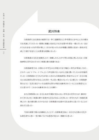 %u767d%u4fdd%u6d77%u5cb8%u306b%u3042%u308b%u6d77%u57a3%u306e%u8996%u5bdf%u3067%u306f%u3001%u674e%u4ec1%u5bcc%u9867%u554f%u3055%u3093%u3068%u674e%u5e78%u975c%u3055%u3093%u3092%u4e2d%u5fc3%u306b%u77f3%u306e%u7a4d%u307f%u65b9%u3092%u5b9f%u6f14%u3057%u3066%u304f%u3060%u3055%u3063%u305f%u3002%u9699%u9593%u306b%u7dba%u9e97%u306b%u53ce%u307e%u308b%u3088%u3046%u306a%u77f3%u3092%u63a2%u3059%u4f5c%u696d%u3092%u4e00%u7dd2%u306b%u884c%u3063%u305f%u3002%u826f%u3055%u305d%u3046%u306a%u77f3%u3092%u898b%u3064%u3051%u308b%u4f5c%u696d%u304c%u697d%u3057%u304f%u3001%u81ea%u5206%u304c%u898b%u3064%u3051%u305f%u77f3%u304c%u7dba%u9e97%u306b%u9699%u9593%u306b%u53ce%u307e%u308a%u3001%u6d77%u57a3%u304c%u5b8c%u6210%u3057%u3066%u304f%u69d8%u5b50%u3092%u898b%u305f%u3053%u3068%u306f%u8cb4%u91cd%u306a%u7d4c%u9a13%u306b%u306a%u3063%u305f%u3002%u767d%u4fdd%u96c6%u843d%u306e%u6587%u5316%u3092%u898b%u805e%u304d%u3057%u305f%u308a%u3001%u4f53%u9a13%u3057%u305f%u308a%u3057%u305f%u4e2d%u3067%u7279%u306b%u5370%u8c61%u306b%u6b8b%u3063%u305f%u306e%u306f%u3001%u767d%u4fdd%u6d77%u795e%u796d%u3068%u9752%u5e74%u4f1a%u306e%u65b9%u3005%u306e%u4e09%u5473%u7dda%u3068%u6b4c%u306e%u62ab%u9732%u3067%u3042%u308b%u3002%u767d%u4fdd%u6d77%u795e%u796d%u3067%u306f%u3001%u767d%u4fdd%u306e%u5c0f%u4e2d%u5b66%u751f%u304b%u3089%u5e74%u914d%u306e%u65b9%u307e%u3067%u5e45%u5e83%u3044%u4e16%u4ee3%u304c%u53c2%u52a0%u3057%u3066%u304a%u308a%u3001%u3069%u306e%u30c1%u30fc%u30e0%u3082%u300c%u30a4%u3001%u30a2%u30eb%u3001%u30a4%u3001%u30a2%u30eb%u300d%u3068%u3044%u3046%u58f0%u3092%u639b%u3051%u5408%u3044%u306a%u304c%u3089%u529b%u5f37%u304f%u6f15%u3044%u3067%u3044%u305f%u306e%u304c%u5370%u8c61%u7684%u3060%u3063%u305f%u3002%u767d%u4fdd%u96c6%u843d%u306e%u5b50%u3069%u3082%u305f%u3061%u304c%u5e7c%u3044%u3068%u304d%u304b%u3089%u767d%u4fdd%u6d77%u795e%u796d%u306b%u53c2%u52a0%u3059%u308b%u3053%u3068%u3067%u3001%u81ea%u5206%u306e%u5730%u5143%u306b%u306f%u4f1d%u7d71%u7684%u306a%u796d%u308a%u304c%u3042%u308b%u3053%u3068%u3092%u77e5%u308a%u3001%u5b66%u3076%u826f%u3044%u6a5f%u4f1a%u306b%u306a%u3063%u3066%u3044%u308b%u3068%u611f%u3058%u305f%u3002%u767d%u4fdd%u6d77%u795e%u796d%u306e%u3088%u3046%u306b%u3001%u751f%u6d3b%u3068%u7d50%u3073%u3064%u3044%u305f%u4f1d%u7d71%u7684%u306a%u796d%u308a%u304c%u73fe%u5728%u3082%u7d99%u627f%u3055%u308c%u3066%u3044%u308b%u3053%u3068%u306f%u8cb4%u91cd%u306a%u3053%u3068%u3060%u3068%u601d%u3046%u306e%u3067%u3001%u3053%u308c%u304b%u3089%u3082%u7d99%u627f%u3055%u308c%u308b%u3053%u3068%u3092%u9858%u3046%u3002%u307e%u305f%u767d%u4fdd%u96c6%u843d%u306b%u306f%u3001%u81ea%u5206%u3068%u3042%u307e%u308a%u5e74%u9f62%u304c%u5909%u308f%u3089%u306a%u3044%u9752%u5e74%u4f1a%u306e%u9752%u5e74%u305f%u3061%u304c%u3001%u7d99%u627f%u3055%u308c%u3066%u304d%u305f%u3082%u306e%u3092%u4e09%u5473%u7dda%u3068%u6b4c%u3067%u8868%u73fe%u3059%u308b%u6587%u5316%u304c%u3042%u308b%u3053%u3068%u3092%u77e5%u3063%u305f%u3002%u9752%u5e74%u305f%u3061%u304c%u4e09%u5473%u7dda%u3092%u6f14%u594f%u3057%u305f%u308a%u3001%u5cf6%u306e%u6b4c%u3092%u6b4c%u3063%u305f%u308a%u3059%u308b%u306e%u306f%u3001%u767d%u4fdd%u96c6%u843d%u306e%u4f1d%u7d71%u3084%u6587%u5316%u3092%u8a87%u308a%u306b%u601d%u3063%u3066%u3044%u308b%u3053%u3068%u306e%u8868%u308c%u3060%u3068%u601d%u3063%u305f%u3002%u4eca%u56de%u306e%u7814%u4fee%u3067%u69d8%u3005%u306a%u4f53%u9a13%u3092%u3057%u305f%u3053%u3068%u3067%u3001%u767d%u4fdd%u96c6%u843d%u5168%u4f53%u306b%u3001%u81ea%u5206%u305f%u3061%u767d%u4fdd%u306e%u6587%u5316%u3084%u4f1d%u7d71%u3092%u8a87%u308a%u306b%u601d%u3044%u3001%u53d7%u3051%u7d99%u3054%u3046%u3068%u3059%u308b%u610f%u601d%u304c%u898b%u3089%u308c%u3001%u7d20%u6575%u3060%u3068%u601d%u3063%u305f%u3002%u6b66%u5ddd%u601c%u672a170%u5728%u6d77%u4e00%u65b9%u3001%u57a3%u8d77%u7de3%u751f%uff1a%u6c96%u7e69%u00b7%u77f3%u57a3%u00b7%u767d%u4fdd%u7530%u91ce%u7d00%u5be6
