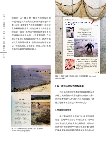 048%u5728%u6d77%u4e00%u65b9%u3001%u57a3%u8d77%u7de3%u751f%uff1a%u6c96%u7e69%u00b7%u77f3%u57a3%u00b7%u767d%u4fdd%u7530%u91ce%u7d00%u5be6%u5716 2-16 %u767d%u4fdd%u5730%u5340%u6d77%u5cb8%u751f%u614b%u8aaa%u660e%uff0f%u674e%u4ec1%u5bcc%u7ffb%u651d%u65bc2024.06.08%uff0c%u767d%u4fdd%u6751%u516c%u6c11%u9928%u5716 2-17 %u767d%u4fdd%u6751%u6d77%u5cb8%u751f%u614b%u6f01%u6cd5%u4ecb%u7d39%uff0f%u674e%u4ec1%u5bcc%u7ffb%u651d%u65bc 2024.06.08%uff0c%u767d%u4fdd%u6751%u516c%u6c11%u9928%u7684%u95dc%u6ce8%u3002%u9019%u4e0d%u50c5 %u662f%u5c0d%u4e00%u7a2e%u53e4%u8001%u6355%u9b5a%u6280%u8853%u7684%u4fdd%u8b77%uff0c%u66f4%u662f%u5c0d%u4eba%u985e%u8207%u81ea%u7136%u548c%u8ae7%u5171%u8655%u667a%u6167%u7684%u5c0a%u91cd%u3002%u672a%u4f86%uff0c%u96a8%u8457%u66f4%u591a%u4eba%u7684%u53c3%u8207%u548c%u95dc%u6ce8%uff0c%u6d77%u57a3%u6587%u5316%u5c07%u7e7c%u7e8c%u767c%u63da%u5149%u5927%uff0c%u6210%u70ba%u5168%u7403%u6c34%u4e0b%u6587%u5316%u907a%u7522%u7684%u91cd%u8981%u4e00%u90e8%u5206%u3002%u6d77%u57a3%u7684%u751f%u614b%u8207%u7d93%u6fdf%u50f9%u503c%u4e0d%u50c5%u50c5%u5c55%u73fe%u5728%u5176%u6355%u9b5a%u529f%u80fd%u4e0a%uff0c%u66f4%u91cd%u8981%u7684%u662f%uff0c%u5b83%u5448%u73fe%u4e86%u4eba%u985e%u8207%u81ea%u7136%u548c%u8ae7%u5171%u8655%u7684%u667a%u6167%u3002%u901a%u904e%u5c0d%u6d77%u57a3%u6587%u5316%u7684%u4fdd%u8b77%u548c%u50b3%u627f%uff0c%u6211%u5011%u53ef%u4ee5%u66f4%u597d%u5730%u7406%u89e3%u9019%u4e00%u53e4%u8001%u6280%u8853%u7684%u6587%u5316%u50f9%u503c%uff0c%u4e26%u70ba%u672a%u4f86%u7684%u751f%u614b%u4fdd%u8b77%u63d0%u4f9b%u5bf6%u8cb4%u7684%u7d93%u9a57%u548c%u555f%u793a%u3002(%u56db) %u6d77%u57a3%u6587%u5316%u306e%u6559%u80b2%u548c%u63a8%u5ee3%u77f3%u57a3%u5cf6%u7684%u6d77%u57a3%u6587%u5316%u6559%u80b2%u548c%u63a8%u5ee3%u6d3b%u52d5%u65b9%u5f0f%u591a%u6a23%u4e14%u5145%u6eff%u5275%u610f%uff0c%u5f9e%u5b78%u6821%u6559%u80b2%u5230%u793e%u5340%u6d3b%u52d5%uff0c%u518d%u5230%u5a92%u9ad4%u5831%u5c0e%uff0c%u77f3%u57a3%u5cf6%u7684%u5c45%u6c11%u548c%u7d44%u7e54%u7686%u4e0d%u907a%u9918%u529b%u5730%u50b3%u627f%u548c%u5ba3%u63da%u9019%u4e00%u7368%u7279%u7684%u6587%u5316%u30021.%u5b78%u6821%u548c%u793e%u5340%u6559%u80b2%u5b78%u6821%u6559%u80b2%u662f%u7576%u5730%u6d77%u57a3%u6587%u5316%u63a8%u5ee3%u7684%u91cd%u8981%u7ba1%u9053%uff0c%u7576%u5730%u5b78%u6821%u8a2d%u8a08%u4e86%u5c08%u9580%u7684%u8ab2%u7a0b%uff0c%u5411%u5b78%u751f%u4ecb%u7d39%u6d77%u57a3%u6587%u5316%u7684%u6b77%u53f2%u548c%u751f%u614b%u50f9%u503c%uff0c%u4f8b%u5982%uff0c%u767d%u4fdd%u570b%u4e2d%u7684%u8001%u5e2b%u6703%u5e36%u5b78%u751f%u9032%u884c%u5be6%u5730%u53c3%u89c0%uff0c%u8b93%u4ed6%u5011%u89aa%u8eab%u9ad4%u9a57%u6d77%u57a3%u7684%u5efa%u9020%u6280%u8853%u548c%u751f%u614b%u529f%u80fd%u3002%u6b64