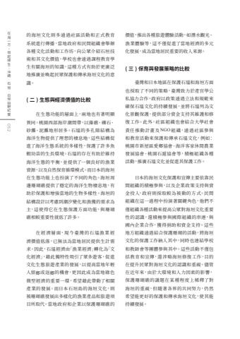 052%u5728%u6d77%u4e00%u65b9%u3001%u57a3%u8d77%u7de3%u751f%uff1a%u6c96%u7e69%u00b7%u77f3%u57a3%u00b7%u767d%u4fdd%u7530%u91ce%u7d00%u5be6%u7684%u6d77%u57a3%u6587%u5316%u5247%u591a%u901a%u904e%u793e%u5340%u6d3b%u52d5%u548c%u6b63%u5f0f%u6559%u80b2%u7cfb%u7d71%u9032%u884c%u50b3%u64ad%uff0c%u7576%u5730%u653f%u5e9c%u548c%u6c11%u9593%u7d44%u7e54%u6703%u8209%u8fa6%u5404%u7a2e%u6587%u5316%u6d3b%u52d5%u548c%u5de5%u4f5c%u574a%uff0c%u5411%u516c%u773e%u4ecb%u7d39%u77f3%u57a3%u6280%u8853%u548c%u5176%u6587%u5316%u50f9%u503c%uff0c%u5b78%u6821%u4e5f%u6703%u901a%u904e%u8ab2%u7a0b%u6559%u80b2%u5b78%u751f%u6709%u95dc%u6d77%u57a3%u7684%u77e5%u8b58%uff0c%u9019%u7a2e%u65b9%u5f0f%u6709%u52a9%u65bc%u66f4%u5ee3%u6cdb%u5730%u63a8%u5ee3%u4e26%u559a%u8d77%u6c11%u773e%u4fdd%u8b77%u548c%u50b3%u627f%u6d77%u57a3%u6587%u5316%u7684%u610f%u8b58%u3002( %u4e8c ) %u751f%u614b%u8207%u7d93%u6fdf%u50f9%u503c%u7684%u6bd4%u8f03%u5728%u751f%u614b%u529f%u80fd%u7684%u5c64%u9762%u4e0a%uff0c%u5169%u5730%u4e5f%u6709%u8457%u660e%u986f%u7570%u540c%u3002%u6843%u5712%u897f%u90e8%u6d77%u5cb8%u6f6e%u9593%u5e36%uff0c%u4ee5%u85fb%u7901%u3001%u792b%u77f3%u3001%u7802%u7058%u3001%u6ce5%u7058%u5730%u5f62%u5c45%u591a%u3002%u77f3%u586d%u7684%u591a%u5b54%u9699%u7d50%u69cb%u70ba%u6d77%u6d0b%u751f%u7269%u63d0%u4f9b%u4e86%u7406%u60f3%u7684%u68f2%u606f%u5730%uff0c%u9019%u4e9b%u7d50%u69cb%u4fc3%u9032%u4e86%u6d77%u6d0b%u751f%u614b%u7cfb%u7d71%u7684%u591a%u6a23%u6027%uff0c%u4fdd%u8b77%u4e86%u8a31%u591a%u9b5a%u8766%u5e7c%u82d7%u7684%u751f%u9577%u74b0%u5883%u3002%u77f3%u586d%u7684%u5b58%u5728%u6709%u52a9%u65bc%u7dad%u6301%u6d77%u6d0b%u751f%u614b%u7684%u5e73%u8861%uff0c%u4e26%u63d0%u4f9b%u4e86%u4e00%u500b%u826f%u597d%u7684%u6f01%u696d%u8cc7%u6e90%uff0c%u4ee5%u53ca%u81ea%u7136%u4fdd%u80b2%u5faa%u74b0%u6a21%u5f0f%u3002%u800c%u65e5%u672c%u7684%u6d77%u57a3%u5728%u751f%u614b%u529f%u80fd%u4e0a%u4e5f%u626e%u6f14%u4e86%u4e0d%u540c%u7684%u89d2%u8272%u3002%u6d77%u57a3%u5468%u908a%u73ca%u745a%u7901%u63d0%u4f9b%u4e86%u7a69%u5b9a%u7684%u6d77%u6d0b%u751f%u7269%u68f2%u606f%u5730%uff0c%u6709%u52a9%u65bc%u4fdd%u8b77%u548c%u589e%u5f37%u7576%u5730%u7684%u751f%u7269%u591a%u6a23%u6027%u3002%u6d77%u57a3%u7684%u7d50%u69cb%u8a2d%u8a08%u4ee5%u8003%u616e%u5230%u6f6e%u6c50%u8b8a%u5316%u548c%u6f01%u7372%u7684%u9700%u6c42%u70ba%u4e3b%uff0c%u9019%u4f7f%u5f97%u5b83%u5728%u751f%u614b%u4fdd%u8b77%u65b9%u9762%u529f%u80fd%uff0c%u8207%u73ca%u745a%u7901%u76f8%u8f03%u91cd%u8981%u6027%u5c31%u4f4e%u4e86%u8a31%u591a%u3002%u5728 %u7d93%u6fdf%u5c64%u9762%uff0c%u73fe%u4eca%u81fa%u7063%u7684%u77f3%u586d%u6f01%u696d%u7d93%u6fdf%u50f9%u503c%u4f4e%u843d%uff0c%u5df2%u7121%u6cd5%u70ba%u7576%u5730%u5c45%u6c11%u63d0%u4f9b%u751f%u8a08%u9700%u6c42%u3002%u56e0%u6b64%uff0c%u77f3%u586d%u7d93%u6fdf%u7531%u300c%u6f01%u696d%u7d93%u6fdf%u300d%u8f49%u5316%u70ba%u300c%u6587%u5316%u7d93%u6fdf%u300d%uff0c%u85c9%u6b64%u7368%u7279%u6027%u5438%u5f15%u4e86%u773e%u591a%u904a%u5ba2%uff0c%u4fc3%u9032%u6587%u5316%u751f%u614b%u65c5%u904a%u7522%u696d%u7684%u767c%u5c55%uff0c%u4ee5%u63d0%u9ad8%u7576%u5730%u5e74%u8f15%u4eba%u7559%u9109%u6216%u8fd4%u9109%u7684%u6a5f%u6703%uff0c%u66f4%u56e0%u6b64%u6210%u70ba%u7576%u5730%u7da0%u8272%u5fae%u578b%u7d93%u6fdf%u7684%u91cd%u8981%u4e00%u74b0%uff0c%u5e0c%u671b%u85c9%u6b64%u5e36%u52d5%u4e86%u76f8%u95dc%u7522%u696d%u7684%u767c%u5c55%u3002%u800c%u65e5%u672c%u77f3%u57a3%u5cf6%u7684%u6d77%u57a3%u6587%u5316%uff0c%u5247%u88ab%u73ca%u745a%u7901%u767c%u5c55%u51fa%u591a%u6a23%u5316%u7684%u6f01%u696d%u7522%u54c1%u548c%u65c5%u904a%u9805%u76ee%u6240%u53d6%u4ee3%u3002%u7576%u5730%u653f%u5e9c%u548c%u4f01%u696d%u4ee5%u4fdd%u8b77%u73ca%u745a%u7901%u7684%u50f9%u503c%uff0c%u63a8%u51fa%u5404%u7a2e%u65c5%u904a%u9ad4%u9a57%u6d3b%u52d5%uff0c%u5982%u6f5b%u6c34%u89c0%u5149%u3001%u6f01%u696d%u9ad4%u9a57%u7b49%uff0c%u9019%u4e0d%u50c5%u4fc3%u9032%u4e86%u7576%u5730%u7d93%u6fdf%u7684%u591a%u5143%u5316%u767c%u5c55%uff0c%u6210%u70ba%u7576%u5730%u5c45%u6c11%u91cd%u8981%u7684%u6536%u5165%u4f86%u6e90%u3002( %u4e09 ) %u4fdd%u80b2%u8207%u767c%u5c55%u7b56%u7565%u7684%u6bd4%u8f03%u81fa%u7063%u548c%u65e5%u672c%u5730%u5340%u5728%u4fdd%u8b77%u77f3%u586d%u548c%u6d77%u57a3%u65b9%u9762%u4e5f%u63a1%u53d6%u4e86%u4e0d%u540c%u7684%u7b56%u7565%uff0c%u81fa%u7063%u81f4%u529b%u65bc%u7522%u5b98%u5b78%u516c%u79c1%u5354%u529b%u5408%u4f5c%uff0c%u653f%u5e9c%u4ee5%u653f%u7b56%u901a%u904e%u7acb%u6cd5%u548c%u898f%u7bc4%u4f86%u78ba%u4fdd%u77f3%u586d%u6587%u5316%u7684%u6301%u7e8c%u767c%u5c55%uff0c%u4e26%u5c07%u77f3%u586d%u5217%u70ba%u6587%u5316%u666f%u89c0%u4fdd%u8b77%uff0c%u63d0%u4f9b%u90e8%u5206%u8cc7%u91d1%u652f%u6301%u5176%u7dad%u8b77%u548c%u4fee%u5fa9%u5de5%u4f5c%u3002%u6b64%u5916%uff0c%u793e%u5340%u7d44%u7e54%u4e5f%u6703%u7d50%u5408%u5927%u5b78%u793e%u6703%u8cac%u4efb%u63a8%u52d5%u8a08%u756b%u53caNGO%u7d44%u7e54%uff0c%u901a%u904e%u793e%u5340%u53c3%u8207%u548c%u6559%u80b2%u6d3b%u52d5%u4f86%u4fdd%u8b77%u548c%u50b3%u627f%u77f3%u586d%u6587%u5316%uff0c%u4f8b%u5982%uff1a%u6843%u5712%u5e02%u65b0%u5c4b%u5340%u611b%u9109%u5354%u6703%u3001%u6d77%u6d0b%u5ba2%u5bb6%u4f11%u9592%u8fb2%u696d%u767c%u5c55%u5354%u6703%u3001%u6843%u5712%u77f3%u6eec%u5354%u6703%u7b49%uff0c%u7a4d%u6975%u7d44%u7e54%u5404%u7a2e%u6d3b%u52d5%uff0c%u63a8%u5ee3%u77f3%u586d%u6587%u5316%u4e26%u4fc3%u9032%u5176%u4fdd%u8b77%u5de5%u4f5c%u3002%u65e5%u672c%u7684%u6d77%u57a3%u6587%u5316%u4fdd%u8b77%u548c%u5ba3%u50b3%u4e3b%u8981%u4f9d%u9760%u6c11%u9593%u7d44%u7e54%u7684%u7a4d%u6975%u53c3%u8207%uff0c%u4ee5%u53ca%u4f01%u696d%u653f%u7b56%u652f%u6301%u8207%u8cc7%u91d1%u6295%u5165%uff0c%u653f%u5e9c%u5247%u63a1%u53d6%u8f03%u70ba%u88ab%u52d5%u7684%u65b9%u5f0f%u3002%u6c11%u9593%u7d44%u7e54%u5728%u9019%u4e00%u904e%u7a0b%u4e2d%u626e%u6f14%u8457%u95dc%u9375%u89d2%u8272%uff0c%u4ed6%u5011%u4e0d%u50c5%u7d44%u7e54%u5404%u7a2e%u6d3b%u52d5%u4f86%u63d0%u9ad8%u516c%u773e%u5c0d%u6d77%u57a3%u6587%u5316%u91cd%u8981%u6027%u7684%u8a8d%u8b58%uff0c%u9084%u7a4d%u6975%u53c3%u8207%u570b%u969b%u7d44%u7e54%u7684%u4e32%u9023%uff0c%u8207%u570b%u5167%u4f01%u696d%u5408%u4f5c%uff0c%u7372%u5f97%u6350%u52a9%u548c%u8cc7%u91d1%u652f%u6301%u3002%