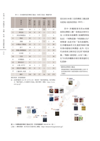 %u662f%u4f4d%u5c45%u65e5%u672c%u7b2c%u4e09%u4f4d%u7684%u50b3%u7d71%u5de5%u85dd%u54c1%u8457%u540d%u7522%u5730%uff08%u7d4c%u6e08%u7523%u696d%u7701%uff0c2023%uff09%u3002%u5176 %u4e2d%uff0c%u6c96 %u7e69 %u7e23 %u4fdd %u6709 %u768416%u9805 %u570b%u5bb6%u6307%u5b9a%u50b3%u7d71%u5de5%u85dd1%uff0c%u4f9d%u7167%u54c1%u76ee%u5225%u53ef%u5206%u70ba%uff1a13%u9805%u67d3%u5e03%u7d21%u7e54%u7269%uff08%u7d21%u7e54%u7269%u8207%u67d3%u8272%u54c1%uff09%u30011%u9805%u9676%u74f7%u5668%u30011%u9805%u6f06%u5668%u4ee5%u53ca1%u9805%u6a02%u5668%uff0c%u7531%u6b64%u53ef%u77e5%uff0c%u300c%u67d3%u5e03%u7d21%u7e54%u7269%u300d%u5728%u6c96%u7e69%u5730%u5340%u7684%u6587%u5316%u907a%u7522%u9818%u57df%u4e2d%u64c1%u6709%u8457%u5353%u8d8a%u5730%u4f4d%u8207%u50f9%u503c%u3002%u6b64%u5916%uff0c%u5145%u5206%u4ee3%u8868%u7409%u7403%u738b%u671d%u5bae%u5ef7%u6587%u5316%u7684%u300c%u7409%u7403%u6f06%u5668%u300d%u3001%u300c%u9676%u5668%uff08%u58fa%u5c4b%u713c%uff09%u300d%u4ee5%u53ca%u300c%u4e09%u7dda%u300d%uff0c%u5728%u4eca%u65e5%u7684%u6c96%u7e69%u7e23%u4ea6%u4fdd%u5b58%u8457%u6df1%u9060%u7684%u6587%u5316%u610f%u6db5%u30021 %u570b%u5bb6%u6307%u5b9a%u50b3%u7d71%u5de5%u85dd%u54c1%u9808%u6839%u64da%u8207%u50b3%u7d71%u5de5%u85dd%u54c1%u7522%u696d%u632f%u8208%u76f8%u95dc%u4e4b%u6cd5%u5f8b%uff0c%u7b26%u5408%u6240%u6709%u8981%u6c42%u9805%u76ee%uff0c%u7531%u7d93%u6fdf%u7522%u696d%u5927%u81e3%u8a8d%u53ef%u6838%u51c6%u4e4b%u5de5%u85dd%u54c1%u3002%u8a3b 1%uff1a%u8cc7%u6599%u4f86%u6e90%u2015%u304a%u304d%u306a%u308f%u5de5%u82b8%u306e%u793e ( %u7db2%u5740%uff1ahttps://okinawa-kougeinomori.jp/%uff09058%u5728%u6d77%u4e00%u65b9%u3001%u57a3%u8d77%u7de3%u751f%uff1a%u6c96%u7e69%u00b7%u77f3%u57a3%u00b7%u767d%u4fdd%u7530%u91ce%u7d00%u5be6%u8868 3-1 %u65e5%u672c%u570b%u5bb6%u6307%u5b9a%u50b3%u7d71%u5de5%u85dd%u54c1%uff08%u4f1d%u7d71%u5de5%u82b8%u54c1%uff09%u6578%u91cf%u5217%u8868%u8cc7%u6599%u4f86%u6e90%uff1a%u8a31%u5bb9%u6995%u88fd%u8868%u8a3b%uff1a%u6b64%u8cc7%u6599%u622a%u81f3 2023 %u5e74 10 %u6708 26 %u65e5%uff0c%u53d6%u81ea%u65bc%u300c%u7d4c%u6e08%u7523%u696d%u7701%u300d%u5b98%u65b9%u7db2%u7ad9%u4e4b%u300c%u56fd%u304c%u6307%u5b9a%u3057%u305f%u4f1d%u7d71%u7684%u5de5%u82b8%u54c1%u300d%u7d71%u8a08%u8cc7%u6599%uff08%u7db2%u5740%uff1ahttps://www.meti.go.jp/%uff091 %u7d21%u7e54%u7269%u67d3%u8272%u54c1%u7522%u696d%u5225%u7e3d%u8a08%uff08%u4ef6%uff09%u5730%u5340%u6771%u4eac%u90fd%u4eac%u90fd%u5e9c%u6c96%u7e69%u7e23%u65b0%u6f5f%u7e23%u5176%u4ed6%u5730%u534023 %u5176%u4ed6%u7d21%u7e54%u7522%u54c14 %u9676%u74f75 %u6f06%u56686 %u6728%u88fd%u54c1%u3001%u7af9%u88fd%u54c17 %u91d1%u5de58 %u4f5b%u58c7%u3001%u4f5b%u6559%u5668%u76bf9 %u65e5%u672c%u7d1910 %u6587%u517711 %u77f3%u88fd%u85dd%u54c112 %u8cb4%u77f3%u52a0%u5de513 %u4eba%u5076%u3001%u6728%u82a5%u5b50%u5176%u4ed6%u624b%u5de5%u85dd%u54c115 %u5de5%u85dd%u6750%u6599%u3001%u7528%u5177%u7e3d%u8a081438 3 1 12 7 1514 4 4 1 - 55 - 5 - - 332 - 1 1 - 3023 - 1 1 2 1933 2 1 - 1 2914 2 - - 2 1217 - 2 - 3 159 - - - - 910 - - - - 104 - 1 - - 32 - - - - 210 3 1 - - 63 - - - - 325 8 3 1 - 13214 22 17 16 15 171%u5716 3-1 %u6c96%u7e69%u7e23%u570b%u5bb6%u50b3%u7d71%u5de5%u85dd%u54c1%u5206%u4f48%uff0f%u8a31%u5bb9%u6995%u7ffb%u651d%u65bc 2024.05.30%uff0c%u8a3b 1%u3002