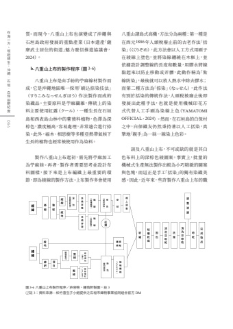 %u5716 3-6 %u516b%u91cd%u5c71%u4e0a%u5e03%u88fd%u4f5c%u7a0b%u5e8f%uff0f%u8a31%u5bb9%u6995%u3001%u937e%u4f91%u8ed2%u88fd%u5716%uff0c%u8a3b 3%u8a3b 3%uff1a%u8cc7%u6599%u4f86%u6e90%u2015%u677e%u7af9%u559c%u751f%u5b50%u5c0f%u59d0%u63d0%u4f9b%u4e4b%u77f3%u57a3%u5e02%u7e54%u7269%u4e8b%u696d%u5354%u540c%u7d44%u5408%u5b98%u65b9 DM064%u5728%u6d77%u4e00%u65b9%u3001%u57a3%u8d77%u7de3%u751f%uff1a%u6c96%u7e69%u00b7%u77f3%u57a3%u00b7%u767d%u4fdd%u7530%u91ce%u7d00%u5be6%u8cea%u3002%u800c%u73fe%u4eca%uff0c%u516b%u91cd%u5c71%u4e0a%u5e03%u4e5f%u6f14%u8b8a%u6210%u4e86%u6c96%u7e69%u8207%u77f3%u57a3%u5cf6%u653f%u5e9c%u767c%u5c55%u7684%u91cd%u9ede%u7522%u696d%uff08%u65e5%u672c%u907a%u7522%u300c%u85a9%u6469%u6b66%u58eb%u5c45%u4f4f%u7684%u8857%u9053%u300d%u9b45%u529b%u767c%u4fe1%u63a8%u9032%u5354%u8b70%u6703%uff0c2024%uff09%u3002%u516b%u91cd%u5c71%u4e0a%u5e03%u662f%u7531%u624b%u7d21%u7684%u82e7%u9ebb%u7dda%u6750%u88fd%u4f5c%u800c%u6210%uff0c%u5b83%u662f%u6c96%u7e69%u5730%u5340%u552f%u4e00%u63a1%u7528%u300c%u5237%u8fbc%u637a%u67d3%u6280%u6cd5%u300d%uff08%u3059%u308a%u3053%u307f%u306a%u3063%u305b%u3093%u304e%u307b%u3046%uff09%u4f5c%u6cd5%u88fd%u4f5c%u800c%u6210%u7684%u67d3%u7e54%u54c1%u3002%u4e3b%u8981%u539f%u6599%u662f%u82e7%u9ebb%u7e96%u7dad%uff0c%u50b3%u7d71%u4e0a%u7684%u67d3%u6599%u4e3b%u8981%u4f7f%u7528%u7d05%u9732%uff08%u30af%u30fc%u30eb%uff09%uff0c%u4e00%u7a2e%u751f%u9577%u5728%u77f3%u57a3%u5cf6%u548c%u897f%u8868%u5cf6%u5c71%u6797%u4e2d%u7684%u85af%u8577%u79d1%u690d%u7269%uff0c%u8272%u6fa4%u70ba%u6df1%u68d5%u8272%uff0c%u6fc3%u5ea6%u6975%u9ad8%uff0c%u5bb9%u6613%u8655%u7406%uff0c%u975e%u5e38%u9069%u5408%u9032%u884c%u637a%u67d3%u3002%u6b64%u5916%uff0c%u798f%u6728%u3001%u76f8%u601d%u6a39%u7b49%u591a%u7a2e%u4e9e%u71b1%u5e36%u6c23%u5019%u4e0b%u751f%u9577%u7684%u690d%u7269%u4e5f%u7d93%u5e38%u88ab%u4f7f%u7528%u4f5c%u70ba%u67d3%u6599%u3002%u88fd%u4f5c%u516b%u91cd%u5c71%u4e0a%u5e03%u8d77%u521d%uff0c%u9700%u5148%u5c07%u82e7%u9ebb%u52a0%u5de5%u70ba%u82e7%u9ebb%u7d72%u3002%u518d%u8005%uff0c%u88fd%u4f5c%u8005%u9700%u8981%u601d%u8003%u4e26%u8a2d%u8a08%u5e03%u6599%u5716%u6a23%uff0c%u63a5%u4e0b%u4f86%u662f%u4e0a%u5e03%u7de8%u7e54%u4e0a%u6700%u91cd%u8981%u7684%u74b0%u7bc0%uff0c%u5373%u70ba%u7dbe%u7dda%u7684%u88fd%u4f5c%u65b9%u6cd5%u3002%u4e0a%u5e03%u88fd%u4f5c%u591a%u6703%u4f7f%u7528%u516b%u91cd%u5c71%u8af8%u5cf6%u5f0f%u9ad8%u6a5f%uff0c%u65b9%u6cd5%u5206%u70ba%u5169%u7a2e%uff1a%u7b2c%u4e00%u7a2e%u662f%u5728%u897f%u51431886%u5e74%u4eba%u982d%u7a05%u5ee2%u6b62%u524d%u7684%u53e4%u8001%u4f5c%u6cd5%u300c%u62ec%u67d3%u300d%uff08%u304f%u304f%u308a%u305e%u3081%uff09%uff0c%u6b64%u65b9%u6cd5%u6703%u4ee5%u4eba%u5de5%u65b9%u5f0f%u7528%u5237%u5b50%u5728%u7dbe%u7dda%u4e0a%u5857%u8272%uff0c%u4e26%u5c07%u67d3%u7dda%u7e8f%u7e5e%u5728%u6728%u6846%u4e0a%uff0c%u4e26%u4f9d%u64da%u8a2d%u8a08%u8abf%u6574%u7dda%u7684%u9577%u5ea6%u548c%u6578%u91cf%uff0c%u7528%u81a0%u6c34%u5c07%u7dda%u9ecf%u8d77%u4f86%u4ee5%u9632%u6b62%u79fb%u52d5%u6216%u5f04%u9ad2%uff0c%u6b64%u52d5%u4f5c%u7a31%u70ba%u300c%u7d2e%u7dda%u9632%u67d3%u300d%uff0c%u6700%u5f8c%u5c31%u53ef%u4ee5%u653e%u5165%u71b1%u6c34%u4e2d%u9664%u53bb%u81a0%u6c34%uff1b%u800c%u7b2c%u4e8c%u7a2e%u65b9%u6cd5%u70ba%u300c%u637a%u67d3%u300d%uff08%u306a%u3063%u305b%u3093%uff09%uff0c%u6b64%u4f5c%u6cd5%u6709%u5225%u65bc%u62ec%u67d3%u7684%u50b3%u7d71%u4f5c%u6cd5%uff0c%u4eba%u982d%u7a05%u88ab%u5ee2%u6b62%u5f8c%u5373%u767c%u5c55%u51fa%u6b64%u7a2e%u624b%u6cd5%uff0c%u4e5f%u5c31%u662f%u4f7f%u7528%u6a5f%u68b0%u5370%u82b1%u65b9%u5f0f%u4ee3%u66ff%u4eba%u5de5%u624b%u5237%u70ba%u67d3%u7dda%u4e0a%u8272%uff08YAMATOMI OFFICIAL%uff0c2024%uff09%u3002%u7136%u800c%uff0c%u5728%u77f3%u57a3%u5cf6%u7684%u767d%u4fdd%u6751%u4e4b%u4e2d%uff0c%u767d%u4fdd%u7e54%u53cb%u4ecd%u7136%u79c9%u6301%u8457%u4ee5%u4eba%u5de5%u62ec%u67d3%uff0c%u771f%u646f%u5730%u300c%u89aa%u624b%u300d%u70ba%u4e00%u7d72%u4e00%u7dda%u67d3%u4e0a%u8272%u5f69%u3002%u8ac7%u53ca%u516b%u91cd%u5c71%u4e0a%u5e03%uff0c%u4e0d%u53ef%u6216%u7f3a%u7684%u5c31%u662f%u5176%u767d%u8272%u5e03%u6599%u4e0a%u7684%u6df1%u68d5%u8272%u7dbe%u5716%u6848%u3002%u4e8b%u5be6%u4e0a%uff0c%u6279%u91cf%u7684%u6a5f%u68b0%u5f0f%u751f%u7522%u7121%u6cd5%u88fd%u4f5c%u51fa%u8f03%u70ba%u5c0f%u5de7%u7cbe%u7dfb%u7684%u5716%u6848%u8207%u8272%u584a%uff0c%u800c%u9019%u6b63%u662f%u624b%u5de5%u300c%u62ec%u67d3%u300d%u7684%u7368%u6709%u67d3%u7e54%u7f8e%u611f%u3002%u56e0%u6b64%uff0c%u8fd1%u5e74%u4f86%uff0c%u4e9b%u8a31%u88fd%u4f5c%u516b%u91cd%u5c71%u4e0a%u5e03%u7684%u8077b.%u516b%u91cd%u5c71%u4e0a%u5e03%u7684%u88fd%u4f5c%u7a0b%u5e8f%uff08%u57163-6%uff09