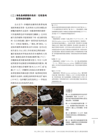 %u81ea%u53e4%u81f3%u4eca%uff0c%u6c96%u7e69%u7fa4%u5cf6 %u7368 %u7279%u7684 %u71b1 %u5e36%u5730 %u7406%u6c23%u5019%u8207%u671d%u8ca2%u80cc%u666f%uff0c%u5148%u6c11%u5229%u7528%u5927%u81ea%u7136%u5404%u7a2e%u8272%u5f69%u9bae%u8c54%u7684%u690d%u7269%u4f5c%u70ba%u67d3%u6599%uff0c%u4f46%u96a8%u8457%u6642%u9593%u7684%u63a8%u79fb%uff0c%u53ea%u6709%u80fd%u5920%u5c07%u8272%u5f69%u7262%u56fa%u5730%u7559%u5728%u7e96%u7dad%u4e0a%uff0c%u4e14%u5177%u6709%u8010%u4e45%u6027%u7684%u690d%u7269%u624d%u80fd%u88ab%u4fdd%u7559%u4e0b%u4f86%uff0c%u6210%u70ba%u5be6%u7528%u67d3%u6599%u3002%u5728%u767d%u4fdd%u67d3%u7e54%u5de5%u85dd%u4e2d%uff0c%u7d93%u5e38%u7528%u65bc%u67d3%u6599%u8272%u7cfb%u6709%u4e09%uff0c%u5206%u5225%u70ba%u300c%u975b%u85cd%u8272%u300d%u3001%u300c%u8910%u8272%u300d%u8207%u300c%u9ec3%u8272%u300d%uff0c%u4e0a%u8ff0%u67d3%u6599%u690d%u7269%u4f86%u6e90%u7686%u4f86%u81ea%u65bc%u77f3%u57a3%u5cf6%uff0c%u4e5f%u53ef%u4ee5%u5728%u677e%u7af9%u559c%u751f%u5b50%u5973%u58eb%u7684%u5de5%u4f5c%u574a%u770b%u5230%u5b83%u5011%u7684%u8eab%u5f71%uff0c%u5c6c%u65bc%u5c31%u5730%u53d6%u6750%u8403%u53d6%u800c%u4f86%u7684%u8349%u672c%u690d%u7269%u6027%u5929%u7136%u67d3%u6599%u3002%u975b%u85cd%u8272%u67d3%u6599%u591a%u4f86%u6e90%u81ea%u690d%u7269%u300c%u85cd(%u30a2%u30a4)3%u300d%uff0c%u6c96%u7e69%u7fa4%u5cf6%u4f7f%u7528%u85cd%u67d3%u7684%u6b77%u53f2%u60a0%u4e45%uff0c%u65e9%u5728%u5341%u4e94%u4e16%u7d00%u6642%u5c31%u66fe%u6709%u7d00%u9304%u63d0%u53ca%u8207%u90a3%u570b%u5cf6%u4f7f%u7528%u85cd%u67d3%uff1b%u8910%u8272%u67d3%u6599%u591a%u6e90%u81ea%u65bc%u690d%u7269%u300c%u86ed%u6728 (%u30d2%u30eb%u30ae )4%u300d%u6216%u300c%u7d05%u9732 (%u30af%u30fc%u30eb)5%u300d%uff0c%u6c96%u7e69%u8207%u77f3%u57a3%u5cf6%u81ea%u53e4%u5373%u6703%u4f7f%u7528%uff0c%u524d%u8005%u662f%u5272%u53d6%u5176%u6a39%u76ae%u9032%u884c%u71ac%u716e%uff0c%u5f8c%u8005%u5247%u662f%u5229%u7528%u6839%u90e8%u4f5c%u70ba%u67d3%u6599%uff1b%u800c%u9ec3%u8272%u67d3%u6599%u5247%u591a%u4f86%u81ea%u65bc%u300c%u798f%u6728(%u30d5%u30af%u30ae )6%u300d%uff0c%u70ba%u6c96%u7e69%u4ee3%u8868%u6027%u67d3%u6599%u4e4b%u4e00%uff0c%u8403%u53d6%u51fa%u7684%u9ec3%u8272%u4e5f%u70ba%u77f3%u57a3%u5cf6%u7684%u4ee3%u8868%u8272%u3002( %u4e8c ) %u6d77%u8272%u5cf6%u5dbc%u994b%u8d08%u7684%u8272%u5f69%uff1a%u77f3%u57a3%u5cf6%u5730%u5340%u8349%u672c%u67d3%u6599%u690d%u72693%u85cd%uff08%u30a2%u30a4%uff095%u7d05%u9732%uff08%u30af%u30fc%u30eb%uff096%u798f%u6728%uff08%u30d5%u30af%u30ae%uff09%u70ba%u65e5%u672c%u5730%u5340%u5e38%u7528%u7684%u85cd%u67d3%u67d3%u6599%u690d%u7269%uff0c%u97f3%u540c%u65bc%u65e5%u6587%u4e2d%u7684%u300c%u611b%uff08%u3042%u3044%uff09%u300d%uff0c%u30a2%u30a4%u4e5f%u6703%u64b0%u5beb%u70ba%u65e5%u6587%u6f22%u5b57%u7684%u300c%u85cd%uff08%u3042%u3044%uff09%u300d%uff0c%u610f%u5473%u8457%u85cd%u8272%u3002%u6839%u64da%u7530%u8abf%u5be6%u969b%u8d70%u8a2a%u767c%u73fe%uff0c%u6c96%u7e69%u8207%u77f3%u57a3%u5cf6%u7576%u5730%u6703%u4f7f%u7528%u84fc%u85cd%uff08%u30bf%u30c7%u30a2%u30a4%uff09%u53ca%u6728%u85cd%uff08%u30ad%u30a2%u30a4%uff09%u7b49%u690d%u7269%u4f86%u8403%u53d6%u85cd%u67d3%u67d3%u6599%u3002%u4e00%u7a2e%u690d%u7269%u985e%u5225%uff0c%u4ea6%u7a31%u70ba%u300c%u30bd%u30e1%u30e2%u30ce%u30a4%u30e2%u300d%uff0c%u5728%u516b%u91cd%u5c71%u7fa4%u5cf6%u88ab%u7a31%u70ba%u300c%u30af%u30fc%u30eb%u300d%uff0c%u5b78%u540d%u70ba Dioscorea cirrhosa%uff0c%u70ba%u85af%u8577%u79d1%u591a%u5e74%u751f%u85e4%u672c%u690d%u7269%u3002%u591a%u5206%u4f48%u65bc%u77f3%u57a3%u5cf6%u548c%u897f%u8868%u5cf6%u7684%u5c71%u5340%uff0c%u53ef%u5f9e%u5176%u584a%u6839%u4e2d%u63d0%u53d6%u68d5%u8272%u67d3%u6599%u3002%u4e00%u7a2e%u690d%u7269%u985e%u5225%uff0c%u5b78%u540d%u70ba Garcinia subelliptica Merr%uff0c%u5c6c%u65bc%u85e4%u9ec3%u79d1%u798f%u6728%u5c6c%uff0c%u5e38%u7da0%u4e2d%u55ac%u6728%uff0c%u53ef%u9ad8%u9054 20 %u516c%u5c3a%uff0c%u591a%u5206%u4f48%u65bc%u83f2%u5f8b%u8cd3%u3001%u81fa%u7063%u3001%u7409%u7403%u7b49%u5730%u5340%uff0c%u8449%u5b50%u5448%u9577%u6a62%u5713%u5f62%uff0c%u679c%u5be6%u6703%u5728%u6bcf%u5e74 8 %u6708%u81f3 9 %u6708%u6210%u719f%u81f3%u9ec3%u8272%uff0c%u53ef%u7528%u4f86%u88fd%u4f5c%u67d3%u6599%u3002%u767d%u4fdd%u6751%u88e1%u4e5f%u7a2e%u690d%u4e86%u798f%u6728%u6a39%u4f5c%u70ba%u9632%u98a8%u6797%u548c%u9632%u706b%u6797%u30024%u86ed%u6728%uff08%u30d2%u30eb%u30ae%uff09%u4e00%u7a2e%u690d%u7269%u985e%u5225%uff0c%u4ea6%u7a31%u70ba%u300c%u516b%u91cd%u5c71%u6f02%u6728%uff08%u30e4%u30a8%u30e4%u30de%u30d2%u30eb%u30ae%uff09%u300d%uff0c%u5b78%u540d%u70ba Rhizophora stylosa Griff%uff0c%u5c6c%u65bc%u70ba%u7d05%u6a39%u6797%u79d1%uff0c%u5e38%u7da0%u55ac%u6728%uff0c%u70ba%u7d05%u6a39%u6797%u7684%u7d44%u6210%u7269%u7a2e%u4e4b%u4e00%uff0c%u751f%u9577%u65bc%u71b1%u5e36%u3001%u4e9e%u71b1%u5e36%u6cb3%u53e3%u53ca%u6f6e%u7058%u7b49%u9e79%u6c34%u6c34%u57df%uff0c%u666e%u904d%u5206%u4f48%u65bc%u6c96%u7e69%u7fa4%u5cf6%u3001%u5bae%u53e4%u5cf6%u8207%u516b%u91cd%u5c71%u7fa4%u5cf6%uff0c%u5176%u6a39%u76ae%u53ef%u71ac%u716e%u4f5c%u70ba%u67d3%u6599%uff0c%u4e5f%u53ef%u4f5c%u70ba%u6728%u6750%u548c%u6728%u70ad%u7684%u539f%u6599%u3002%u5176%u4e2d%uff0c%u53d7%u8a2a%u8005%u63d0%u53ca%u86ed%u6728%u591a%u751f%u9577%u65bc%u6cb3%u8ddf%u6d77%u6c34%u7684%u6f6e%u9593%u5e36%u4ea4%u754c%uff0c%u7136%u800c%u767d%u4fdd%u6751%u4e26%u6c92%u6709%u7d05%u6a39%u6797%uff0c%u9700%u524d%u81f3%u77f3%u57a3%u5cf6%u897f%u5317%u90e8%u7684%u5ddd%u5e73%u7063%u6216%u897f%u8868%u5cf6%u624d%u53ef%u7372%u5f97%uff0c%u53d7%u5230%u570b%u5bb6%u74b0%u5883%u4fdd%u8b77%u6cd5%u898f%u898f%u5b9a%uff0c%u82e5%u6b32%u5272%u53d6%u8a72%u67d3%u6599%u539f%u6599%u9700%u4e8b%u5148%u7533%u8acb%u3002%u5716 3-18 %u77f3%u57a3%u5cf6%u8910%u8272%u67d3%u6599%u591a%u51fa%u81ea%u65bc%u7d05%u6a39%u6797%u690d%u7269%u300c%u86ed%u6728%uff08%u30d2%u30eb%u30ae%uff09%u300d%uff0c%u88fd%u4f5c%u7a0b%u5e8f%u6703%u53d6%u5176%u6a39%u76ae%u71ac%u716e%u4ee5%u7522%u751f%u8910%u8272%u67d3%u6599%uff0f%u8a31%u5bb9%u6995%u651d%u5716 3-19 %u77f3%u57a3%u5cf6%u7576%u5730%u7522%u7684%u7d05%u9732%uff08%u30af%u30fc%u30eb%uff09%u591a%u88ab%u88fd%u4f5c%u70ba%u7d05%u68d5%u8272%u67d3%u6599%uff0c%u7279%u5225%u7528%u65bc%u516b%u91cd%u5c71%u4