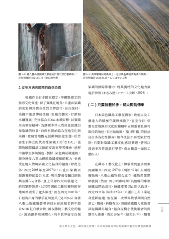 %u5716 3-50 %u5c07%u516b%u91cd%u5c71%u68c9%u72f9%u7e54%u5143%u7d20%u7d50%u5408%u65bc%u73fe%u4ee3%u6d41%u884c%u670d%u98fe%u4e2d%uff0f%u8a31%u5bb9%u6995%u651d%u65bc 2024.06.10%uff0c%u65b0%u77f3%u57a3%u7a7a%u6e2f%u5716 3-51 %u767d%u4fdd%u73ca%u745a%u6751%u7684%u9577%u684c%u4e0a%uff0c%u4e5f%u4ee5%u67d3%u8272%u7e54%u7269%u4f5c%u70ba%u684c%u5dfe%u88dd%u98fe%uff0f%u8a31%u5bb9%u6995%u651d%u65bc 2024.06.08%uff0c%u3057%u3089%u307b%u30b5%u30f3%u30b4%u67512.%u0009%u5f9e%u5730%u65b9%u9081%u5411%u570b%u969b%u7684%u767d%u4fdd%u67d3%u7e54%u67d3%u7e54%u4f5c%u70ba%u65e5%u672c%u570b%u5bb6%u6307%u5b9a%u3001%u6c96%u7e69%u7e23%u6307%u5b9a%u7684%u7121%u5f62%u6587%u5316%u8cc7%u7522%uff0c%u9664%u4e86%u5be6%u8e10%u5728%u5730%u5916%uff0c%u516b%u91cd%u5c71%u67d3%u7e54%u7684%u5149%u5f69%u8207%u73cd%u8cb4%u4e5f%u53d7%u5230%u4e16%u754c%u8a8d%u53ef%u3002%u5728%u767d%u4fdd%u6751%uff0c%u67d3%u7e54%u4e0d%u50c5%u662f%u50b3%u7d71%u6280%u85dd%uff0c%u66f4%u878d%u5408%u89c0%u5149%u3001%u884c%u92b7%u548c%u6c38%u7e8c%u767c%u5c55%uff0c%u5145%u5206%u7d50%u5408SDGs%u6c38%u7e8c%u76ee%u6a19%uff0c%u4ee5%u5be6%u8e10%u91cc%u5c71%u91cc%u6d77%u7cbe%u795e%u3002%u70ba%u8b93%u66f4%u591a%u4e16%u4eba%u770b%u898b%u4e26%u8a8d%u8b58%u767d%u4fdd%u67d3%u7e54%u7684%u73cd%u8cb4%uff0c%u767d%u4fdd%u6751%u958b%u59cb%u7d50%u5408%u5728%u5730%u6587%u5316%u8207%u67d3%u7e54%uff0c%u767c%u5c55%u7576%u5730%u89c0%u5149%u6d3b%u52d5%u8207%u65c5%u904a%u751f%u614b%u3002%u677e%u7af9%u559c%u751f%u5b50%u5275%u7acb%u7684%u4ee3%u8868%u6027%u67d3%u7e54%u5de5%u574a%u300c%u306a%u308f%u305f%u300d%uff0c%u4e5f%u958b%u653e%u570b%u969b%u7e54%u54c1%u5de5%u85dd%u7684%u4ea4%u6d41%u8207%u5b78%u7fd2%u6a5f%u6703%uff0c%u904e%u7a0b%u4e2d%u8b93%u5b78%u751f%u53c3%u8207%u88fd%u8272%u3001%u88fd%u6750%u3001%u67d3%u8272%u8207%u7d21%u7e54%u904e%u7a0b%uff0c%u89aa%u8eab%u611f%u53d7%u516b%u91cd%u5c71%u50b3%u7d71%u67d3%u7e54%u6280%u85dd%u7684%u9b45%u529b%uff0c%u4e26%u611f%u53d7%u5728%u5730%u4eba%u60c5%u8207%u67d3%u7e54%u6587%u5316%u7d50%u5408%u7684%u6eab%u5ea6%u3002%u9664%u6b64%u4e4b%u5916%uff0c%u897f %u5143 2005%u5e74 %u81f3 2007%u5e74%uff0c%u516b %u91cd %u5c71 %u67d3 %u7e54 %u4ee5%u670d%u98fe%u7368%u7279%u7684%u8a2d%u8a08%u5143%u7d20%uff0c%u8207%u5df4%u9ece%u5099%u53d7%u77da%u76ee%u7684%u65b0%u8208%u54c1%u724c%u300ces%u300d%u5408%u4f5c%uff0c%u767b%u4e0a%u516c%u8a8d%u56db%u5927%u6642%u88dd%u9031%u4e4b%u4e00%u7684%u5df4%u9ece%u6642%u88dd%u9031%uff0c%u4ee5%u5176%u7cbe%u6e5b%u7684%u5de5%u85dd%u548c%u7368%u7279%u7684%u5728%u5730%u98a8%u683c%u5438%u5f15%u4e86%u773e%u591a%u95dc%u6ce8%uff0c%u800c%u5728%u897f%u5143 2002%u5e74%uff0c%u77f3%u57a3%u5cf6%u51fa%u8eab%u7684%u6b4c%u624b%u590f%u5ddd%u91cc%u7f8e%uff08%u590f%u5ddd%u308a%u307f%uff09%u7a7f%u8457%u516b%u91cd%u5c71%u67d3%u7e54%u670d%u88dd%u53c3%u8207%u65e5%u672c%u5728%u5730%u77e5%u540d%u8de8%u5e74%u7bc0%u76eeNHK %u7d05%u767d%u6b4c%u5408%u6226%uff0c%u5c55%u73fe%u50b3%u7d71%u5de5%u85dd%u6587%u5316%u7684%u9b45%u529b%uff0c%u901a%u904e%u5275%u65b0%u548c%u570b%u969b%u5316%uff0c%u5411%u5168%u4e16%u754c%u5c55%u793a%u767d%u4fdd%u67d3%u7e54%u7684%u570b%u969b%u5f71%u97ff%u529b%uff0c%u5c07%u5176%u7368%u7279%u7684%u6587%u5316%u9b45%u529b%u5c55%u73fe%u65bc%u4e16%u754c%uff08%u3042%u3056%u307f%u5c4b%u30df%u30f3%u30b5%u30fc%u5de5%u82b8%u9928%uff0c2024%uff09%u3002%u65e5%u672c%u67d3%u8272%u7e54%u54c1%u5de5%u85dd%u5728%u570b%u5bb6%u3001%u653f%u5e9c%u4ee5%u53ca%u5de5%u85dd%u9054%u4eba%u7684%u7a4d%u6975%u5b88%u8b77%u8207%u63a8%u52d5%u4e0b%uff0c%u76f4%u81f3%u4eca%u65e5%uff0c%u4f9d%u820a%u5728%u7576%u5730%u7121%u5f62%u6587%u5316%u7684%u7bc4%u7587%u4e2d%u7acb%u5c45%u91cd%u8981%u4e14%u7121%u53ef%u53d6%u4ee3%u7684%u5730%u4f4d%u3002%u77f3%u57a3%u5cf6%u5730%u5340%uff0c%u300c%u67d3%u300d%u8207%u300c%u7e54%u300d%u7684%u6280%u6cd5%u81ea%u53e4%u591a%u70ba%u5973%u6027%u64cd%u5f04%uff0c%u5982%u4eca%u6280%u6cd5%u4e0d%u518d%u53d7%u9650%u65bc%u6027%u5225%uff0c%u53ea%u8981%u5c0d%u67d3%u7e54%u5de5%u85dd%u6587%u5316%u611f%u5230%u8208%u8da3%uff0c%u7686%u53ef%u4ee5%u900f%u904e%u591a%u65b9%u7ba1%u9053%u9032%u884c%u5b78%u7fd2%uff0c%u6210%u70ba%u7368%u7576%u4e00%u9762%u7684%u5de5%u85dd%u5320%u4eba%u3002%u5728%u7e54%u5e03%u5de5%u85dd%u6587%u5316%u4e0a%uff0c%u50b3%u627f%u53d7%u5230%u773e%u591a%u56e0%u7d20%u800c%u986f%u8271%u8f9b%u3002%u897f%u51431907%u5e74%uff08%u660e%u6cbb40%u5e74%uff09%u4eba%u982d%u7a05%u5ee2%u9664%u5f8c%uff0c%u516b%u91cd%u5c71%u7e54%u7269%u7d44%u5408%u6210%u7acb%uff0c%u7e54%u7269%u7522%u696d%u958b%u59cb%u767c%u5c55%u3002%u7136%u800c%uff0c%u5230%u4e86%u662d%u548c%u6642%u671f%uff0c%u5176%u4ed6%u7e23%u7684%u5ec9%u50f9%u7d21%u7e54%u54c1%u958b%u59cb%u6d41%u884c%uff0c%u7d21%u7e54%u7522%u696d%u56e0%u6b64%u9677%u5165%u4f4e%u8ff7%u3002%u897f%u51431937%u5e74%uff08%u662d%u548c12%u5e74%uff09%uff0c%u516b%u91cd%u5c71%u4e0a%u5e03%u5de5%u696d%u7d44%u5408%u91cd%u65b0%u7d44%u5efa%uff0c%u4f46%u5728%u7b2c%u4e8c%u6b21%u4e16%u754c%u6230%u722d%u671f%u9593%u81ea%u7136%u6d88%u4ea1%u3002%u6230%u5f8c%uff0c%u7d04%u7565%u6709%u4e09%u3001%u56db%u500b%u7d21%u7e54%u8077%u4eba%u91cd%u65b0%u5617%u8a66%u7d44%u7e54%u7e54%u5e03%u7d44%u5408%uff0c%u7d44%u5408%u898f%u6a21%u5c0f%u4f7f%u5f8c%u7e7c%u8005%u7684%u554f%u984c%u4ee4%u4eba%u64d4%u6182%u3002%u897f%u51431976%u5e74%uff08%u662d%u548c51%u5e74%uff09%uff0c%u96a8%u8457( %u4e8c ) %u53ea%u8981%u6280%u85dd%u65bc%u624b%uff0c%u85aa%u706b%u5373%u80fd%u50b3%u627f079%u67d3%u4e0a%u8349%u6728%u4e4b%u8272%uff0c%u7e54%u51fa%u6d77%u4e4b%u7d0b%u7406%uff1a%u65e5%u672c%u77f3%u57a3%u5cf6%u767d%u4fdd%u6751%u7684%u67d3%u7e54%u5de5%u85dd%u6587%u5316%u50f9%u503c%u8207%u5be6%u8e10